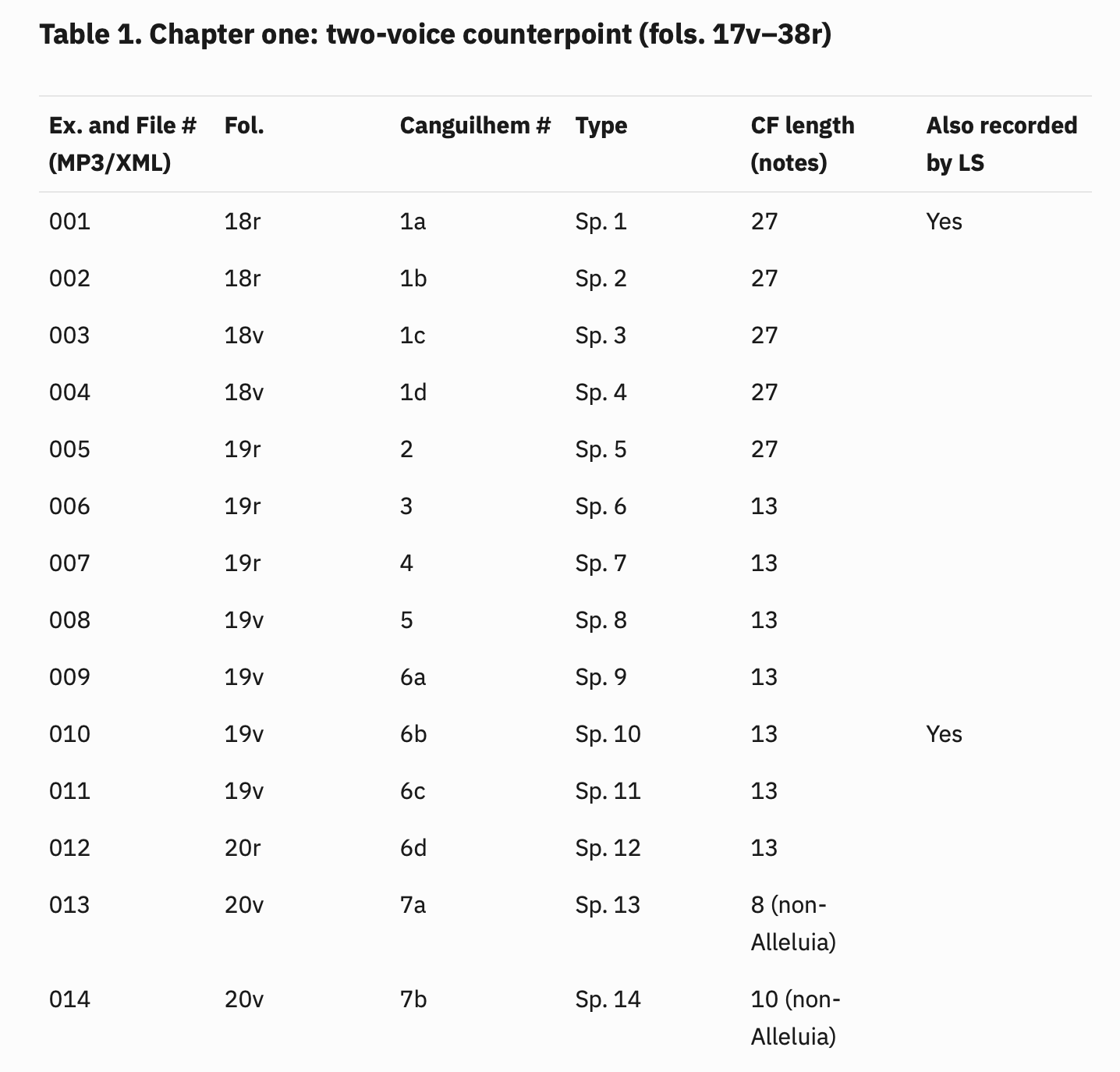 The tables facilitate orientation within the manuscript and support cross-referencing between the source, the numbering adopted in Philippe Canguilhem’s 2013 edition, the modern digital edition, and the associated MusicXML, MIDI, and audio materials. The numbering used here refers to the individual contrapuntal examples transmitted in the manuscript and therefore corresponds to the MusicXML and MIDI files. The CRCE audio recordings employ a separate global numbering system (crce-001–crce-420), since multiple recorded realisations are provided for certain examples.